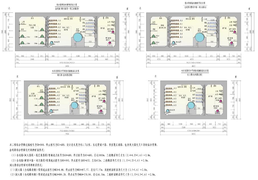 :①斷面凈尺寸為(2.4十4.25十1.6)×2.8M,艙內(nèi)管線有:給水管(管徑DN800)、通信管(16孔,含電信管、交通電纜及有線電視電纜)、電力管(30孔)、2回22KV高壓電力、3回110KV高壓電力及管廊自用電力管,并預留—定空間。②斷面凈尺寸為(1.55十4.25十1.6)×2.8M,艙內(nèi)管線有:給水管(管徑DN800)、通信管(16孔,含電信管、交通電纜及有線電視電纜)、電力管(30孔)、2回22KV高壓電力、3回110KV高壓電力及管廊自用電力管,并預留—定空間。工程總投資10500萬元。