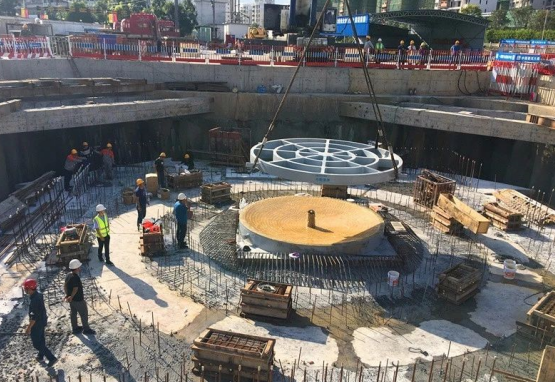 龍巖大橋項目球鉸轉體系統(tǒng)總重達200余噸,設計最大承載能力高達250000KN,相當于2.5個埃菲爾鐵塔,是目前中國建筑系統(tǒng)內(nèi)承載能力最大的球鉸。上球鉸重量為38t,下球鉸重達48t,直徑達5m,上含1758個滑塊嵌槽,采用下凸面設計,由外向內(nèi)逐一編號。