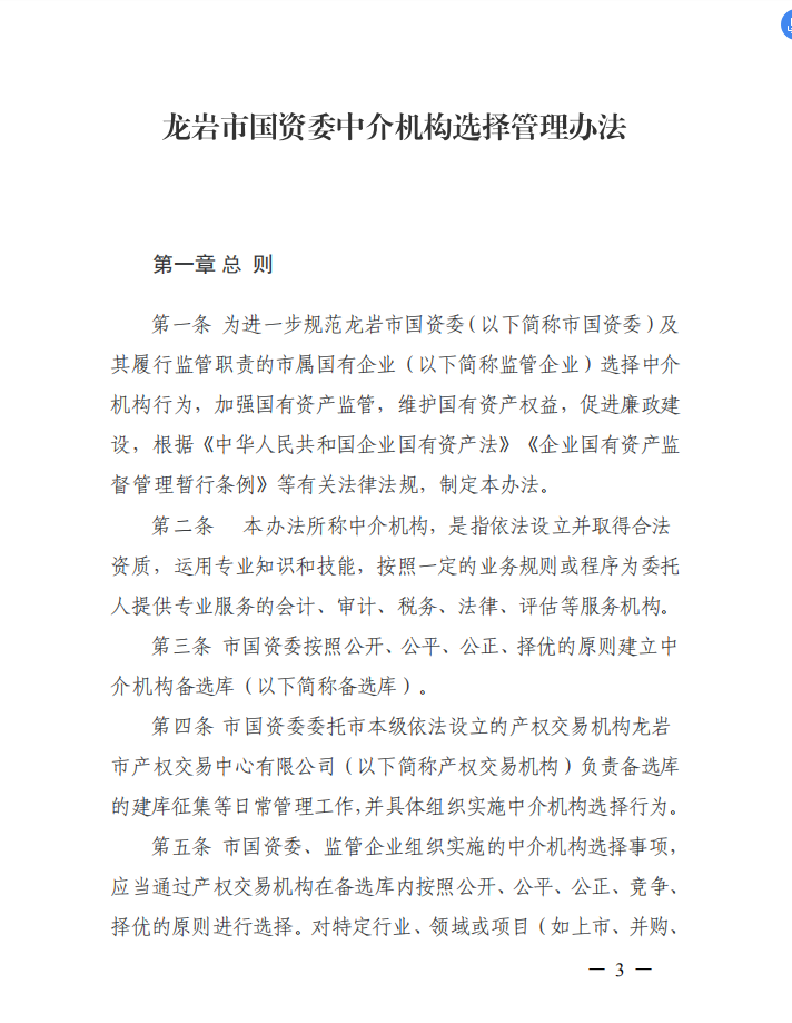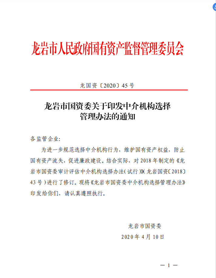 龍巖市國資委關于印發(fā)中介機構選擇管理辦法的通知(龍國資[2020]45號)
